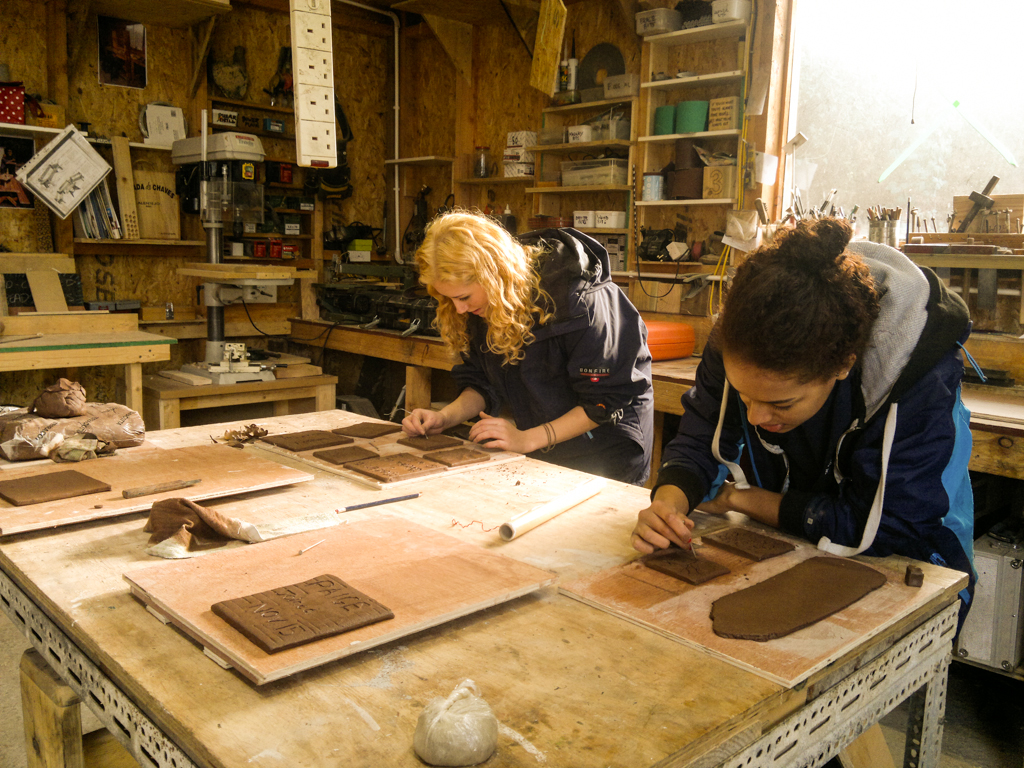 Plymouth University students Megan and Hannah (and Paige who isn’t in the picture) making clay tiles